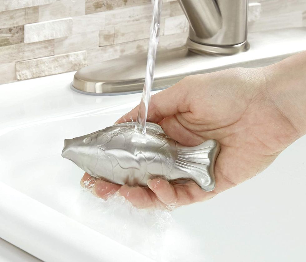 My husband likes to cook fish for dinner, but after preparing it his hands stiiiiiink and there's no soap that'll help. I got him this fish-shaped odor removing bar and it actually works super well! Somehow the stainless steel design absorbs fishy or garlic odors so you don't have to walk around smelling like dinner for the rest of the day.