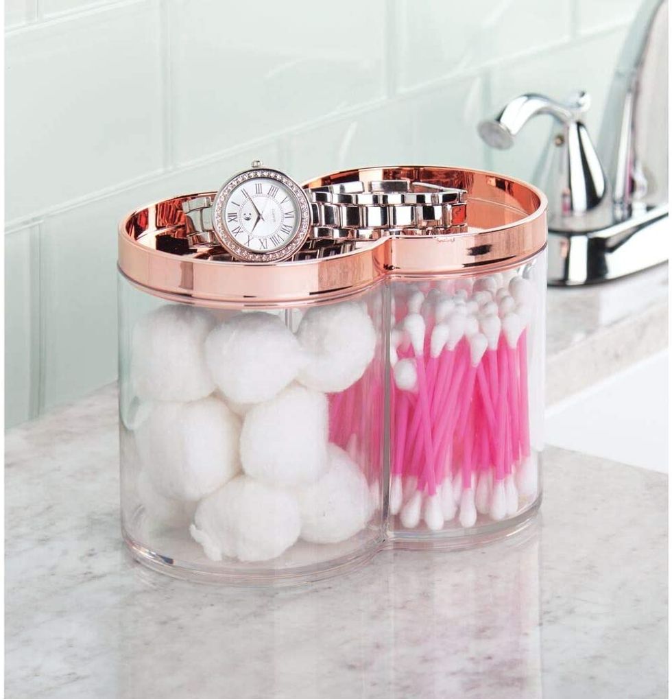 I'm always looking for a place to set my jewelry or watch that I take off to shower or wash my face, and no place on the bathroom counter feels safe. I love this elevated storage jar option to protect my stuff from water, stray toothpaste or whatever else is on the bathroom vanity top. I also love to store everyday items like cotton face pads and Q-tips in plain sight so I can see at a glance when we need a refill.