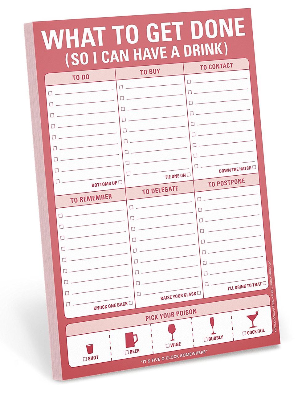 Everyone could use a little motivation every now and then in order to be more productive, right? Well, this Knock Knock 12282 What To Get Done (So I Can Have a Drink) Pad gives you the perfect motivation to get what you need to get done and then reward yourself afterwards. It has spots for "To Do", "To Buy", "To Contact", "To Remember", "To Delegate", and "To Postpone".This Anti-Theft Backpack That Keeps You Protected On-the-Go