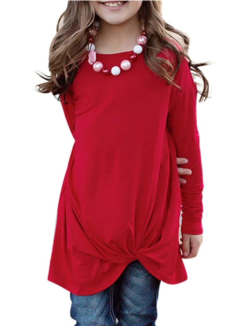 How cute is this girls' long sleeve tee? I love the gathered faux-knotted hem, it adds such a fun look and is a total outfit-maker. I have one just like this and I think it's so cute to dress my kids like a mini-me. Tweens will love the grown-up style, too.
