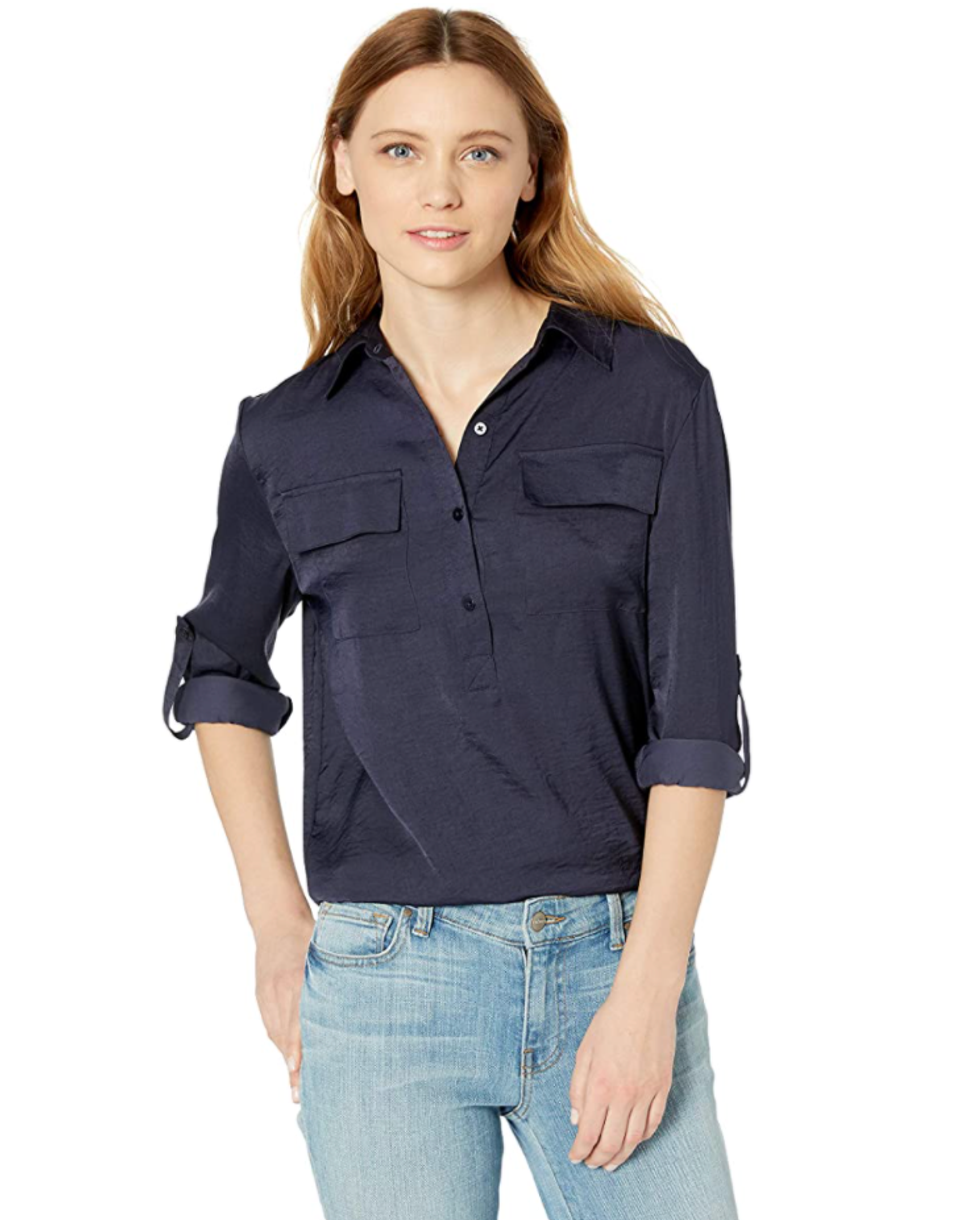 Don't make your boss think you're slacking off when you work from home — just put on this dressy shirt whenever he video conferences you. The zipper lets you choose how revealing the front is, and it pairs effortlessly with dark slacks or leggings.