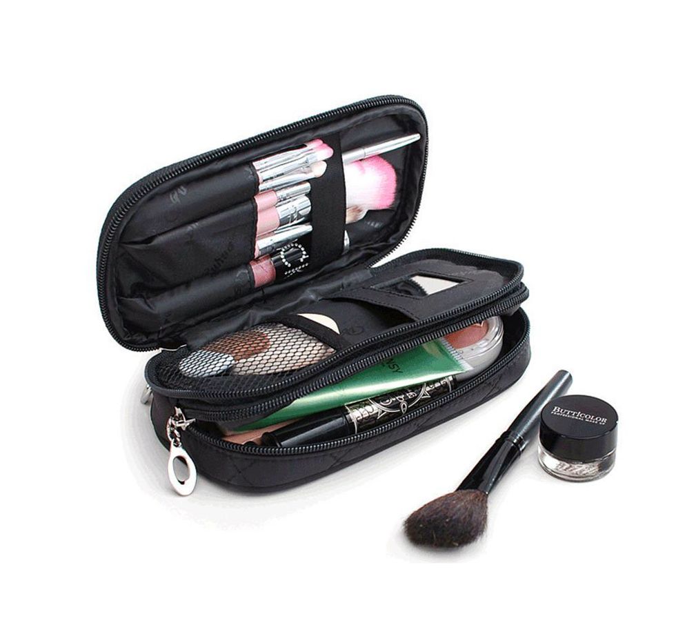I love a good makeup bag. I always somehow feel more put-together when my products are all organized and neatly displayed. This makeup bag does a great job of that. It's divided into two zippered sections. One has slots for makeup brushes and a couple of pouches, plus a built-in mirror. The other section is a larger open compartment for bottles and compacts. It's small (about 7x4x2 inches) and made of nylon, making it lightweight and easy to carry.