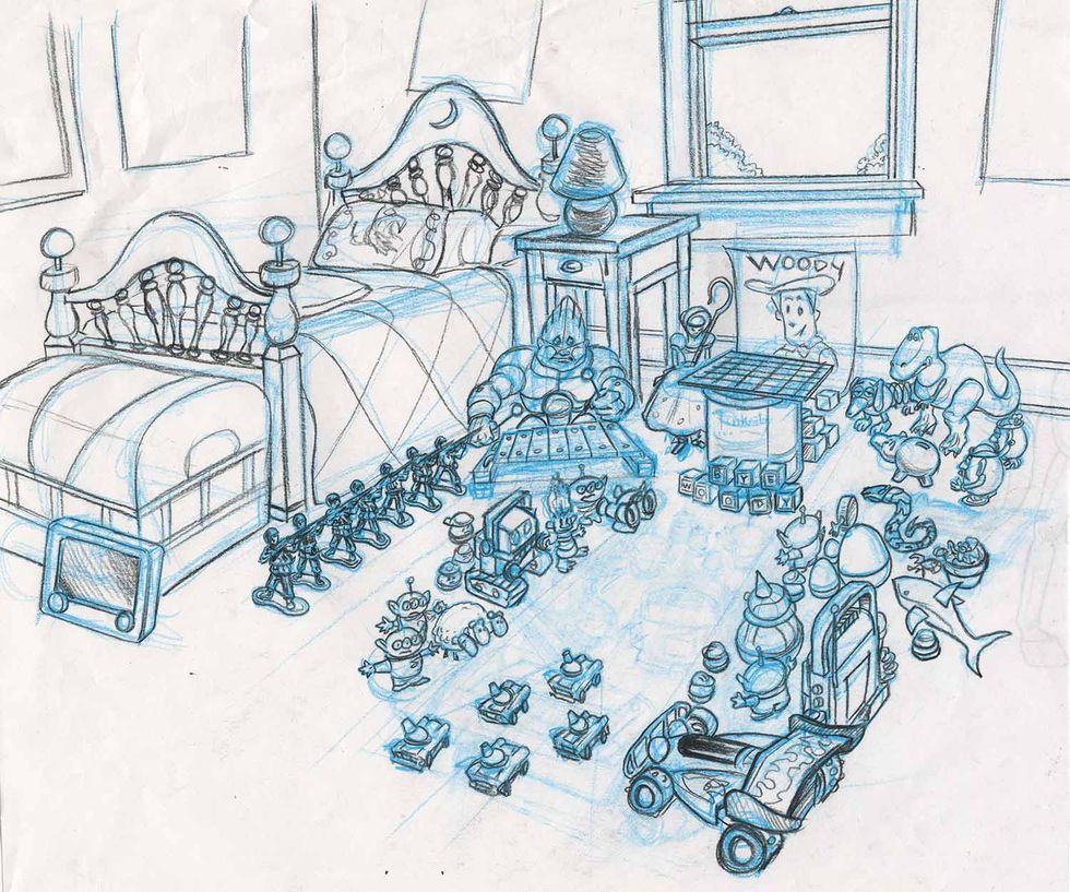 In the first Toy Story movie, Pixar hadn't fully figured out how to animate human characters. Animating clothes was incredibly time-consuming. If you look back at the original movie, you'll see that they got around this by mostly showing hands and feet. This works well for Toy Story as it gives the movie the feel of being from the perspective of the toys.Dimly lit human characters.