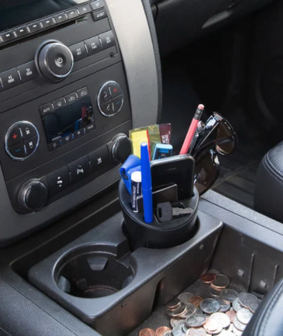 Take advantage of the unused spaces in your car, like your cupholder. This multi-device holder has room for your phone, sunglasses, etc.Trending