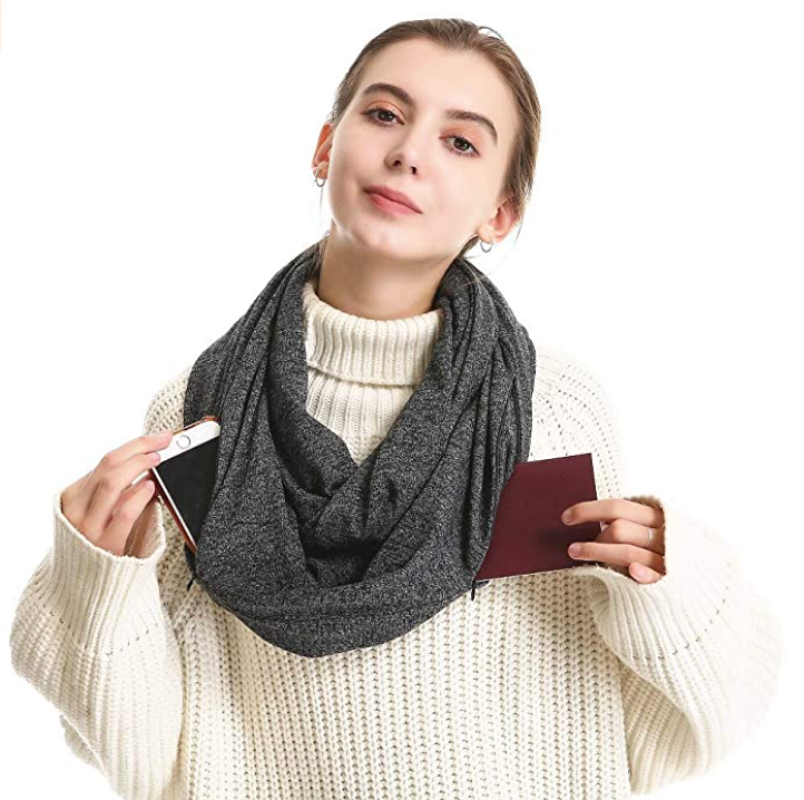 I like this scarf because it features a hidden pocket on the inside. The pocket is large enough for small items like cash and cards, and the fabric is partially made from breathable bamboo.