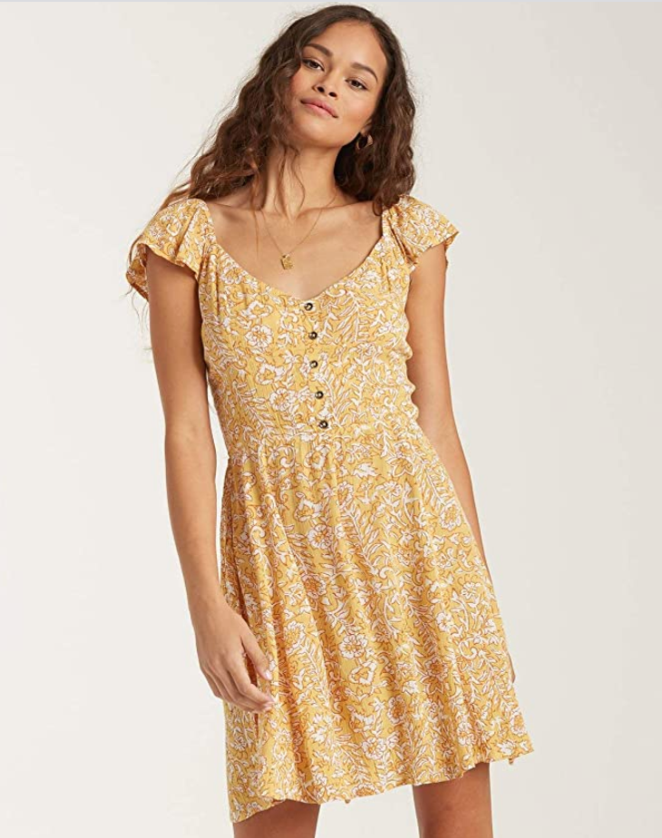 Dress it up with a pair of boots and denim jacket, or just wear this Billabong dress by itself when the weather is warm. The straps are ruffled as a cute detail, and there are two colors to pick from: yellow or green.