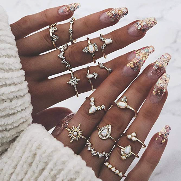 Not only do you get 69 rings in each order, but each one of these rings are also completely unique without any repeats. They come in silver and gold colors — just so that it's even easier to match them to whatever outfit I'm wearing.
