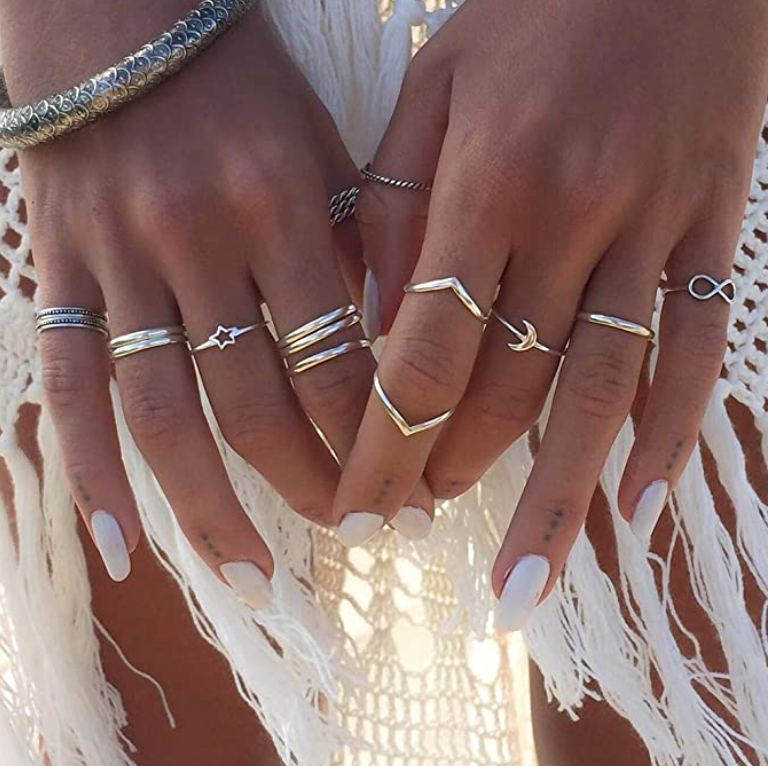 Made from durable metal alloy, this pack of rings is perfect for creating hippie-themed boho looks. Or, if you're like me, they're great for just dressing up your fingers while you're working from home — I stare at my hands all day while I type, why not enjoy what I'm seeing?