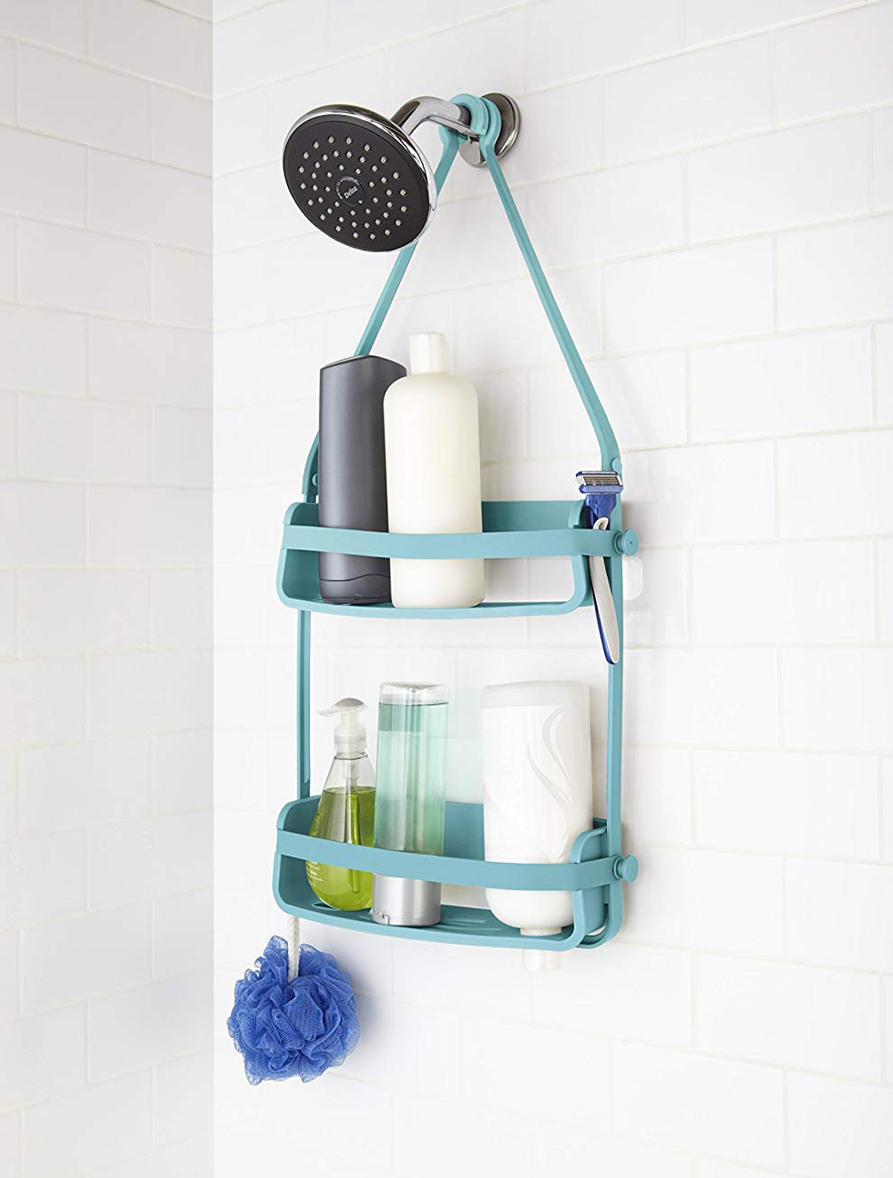 A disgusting layer of slimy mildew builds up pretty fast under all the bottles packed onto our tiny shower shelves and since downsizing my shampoo collection isn't an option, I'm calling this flexible shower caddy in for organizing help! You can mount it in several configurations like over the shower head or on the shower curtain rod depending on your bathroom layout and the extra-wide shelves have a built-in drainage system. My favorite part is the "bottle collars" that let you store bottles upside down so you can use up every last drop!