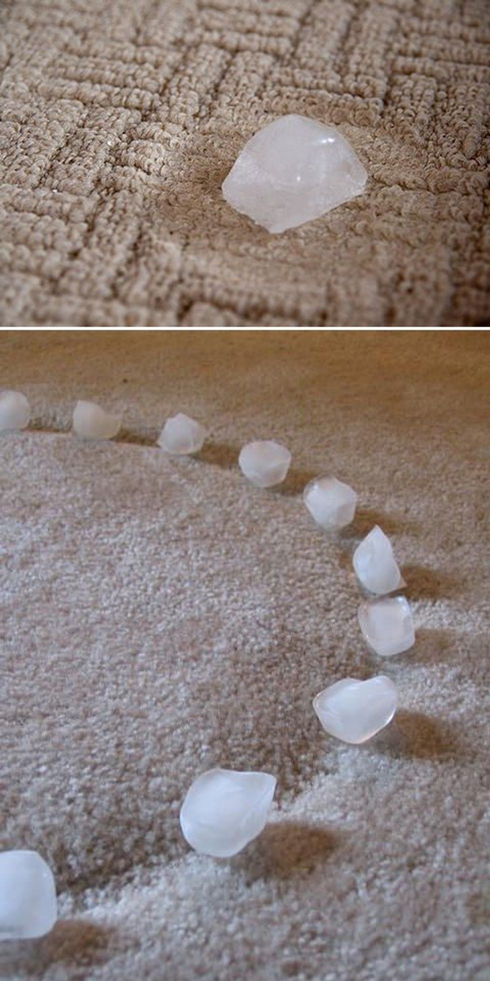 If you want to get rid of the smushed-down carpet look after moving furniture, all you need is some ice cubes. Place the ice cubes in the carpet dent and wait for them to melt. Sop up most of the water with a dishtowel and your carpet should be back to its un-smushed state!Better yet – grab these carpet savers keep your furniture from making dents in the first place.