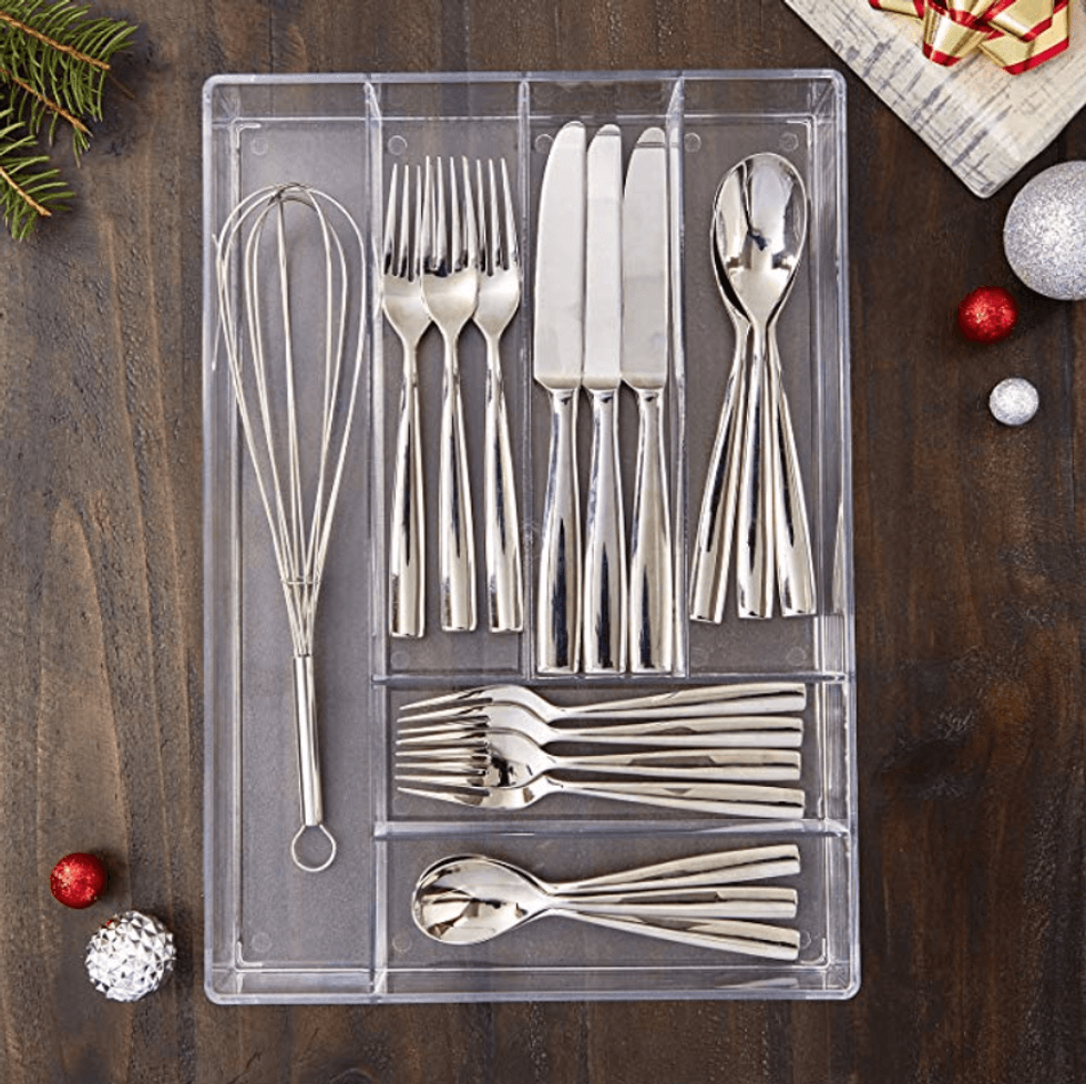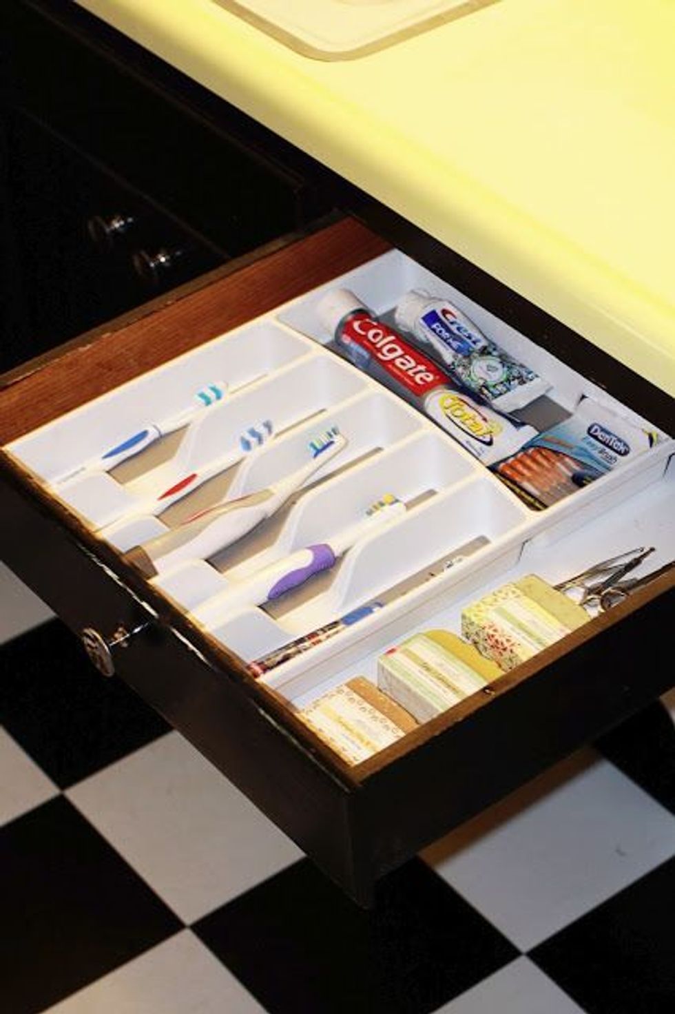 You can use organizational tools throughout your house — not just for their advertised use! This method of using a silverware divider for toothbrushes and toothpaste is absolutely brilliant.For an added bonus, you can purchase clear organizers...