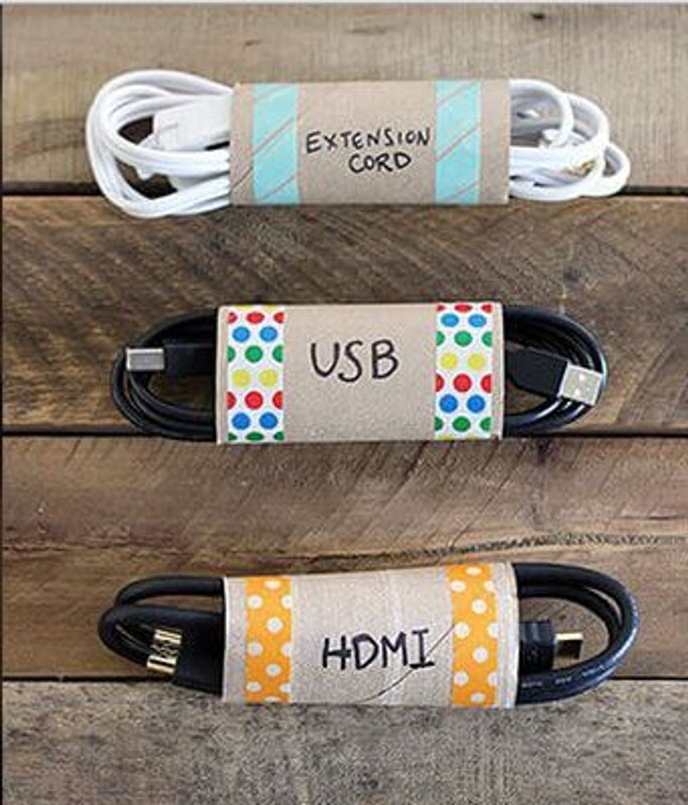 Rather than storing all your various cables in a box or bag, consider wrapping them up and popping them inside an old TP tube (or a paper towel tube cut to size). Then label them so you can always find exactly what you're looking for.You can also purchase velcro straps for your cables.