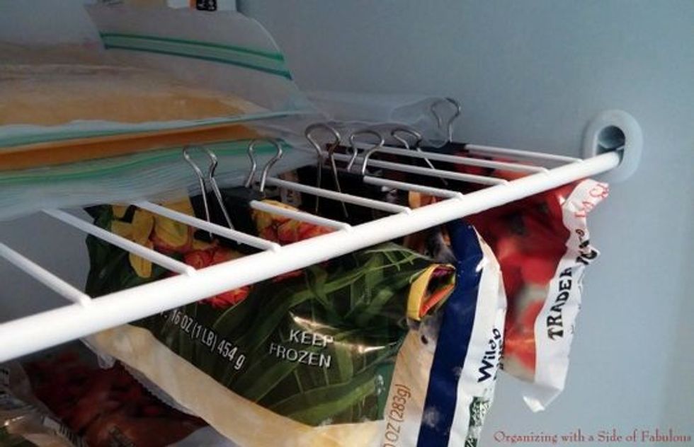 Binder clips are some of the handiest things ever when it comes to home organization. You can use them to clip bags of frozen veggies closed and hook them to the rack in your freezer.On a similar note, these bag clips work well to keep items sealed.
