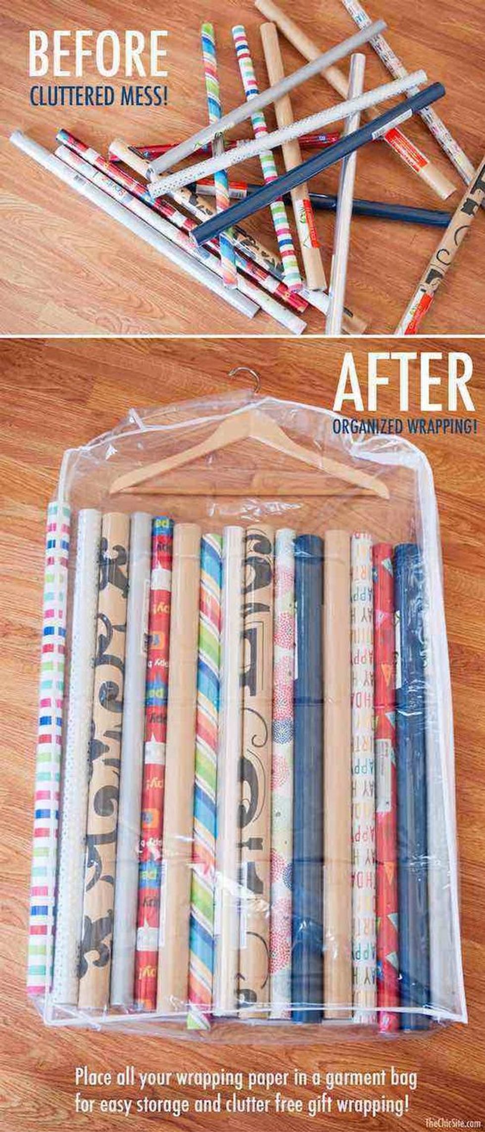 If you have a bunch of rolls of wrapping paper, you're probably familiar with the struggle of having them constantly fall over in your closet and getting crushed. Get them off the floor by placing them in a clear garment bag and hanging them up!Or if you want to get a little fancier, you can purchase this holder: