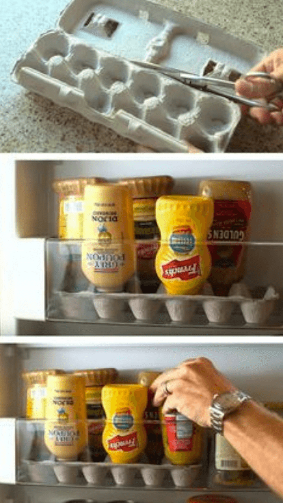 Use an egg carton to store mustard, ketchup, and other squeezable condiments upside-down in your fridge shelves. They'll always be ready-to-use and won't topple out every time you open the fridge door.You can also use these clear storage containers.