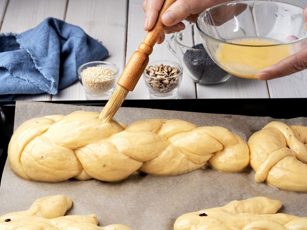 First, take 2/3 of your dough and cut it into three equal pieces. Roll each piece into a rope shape with the palm of your hand until it's roughly the same size as your thumb. Braid these pieces together until it forms a single loaf. Do these same steps with your remaining dough and place it on top of your larger loaf. Let your dough rise again for 30 minutes. Preheat your oven to 375 degrees. Place your loaf on a baking sheet covered with wax paper and brush an egg wash consisting of one beaten egg and a pinch of sugar over your loaf.This is there a pastry brush comes in handy.