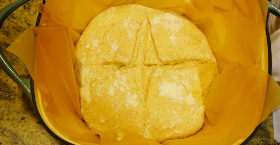 This Lodge 6 Quart Enameled Cast Iron Dutch Oven is the perfect mix of form and function. The enameled cast iron construction is oven safe up to 500 degrees Fahrenheit and provides incredibly even cooking so your meals always turn out perfectly. Plus, the deep blue color looks beautiful on your kitchen counter.Now it's time to get your loaf ready for the oven.