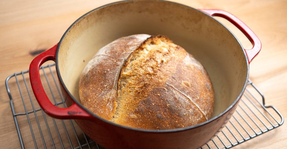 Bake for 25 to 30 minutes, remove the lid, and continue baking for an additional 25 to 35 minutes. Your loaf should be crispy, have a lovely deep golden brown color, and sound hollow when tapped. Don't worry if it feels too crisp since the crust will soften slightly while cooling.Remove your loaf from your Dutch oven and place it on a cooling rack.