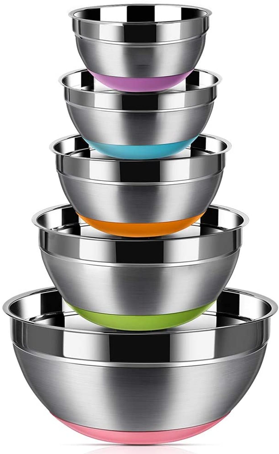 You want to make sure that you're using a bowl that has plenty of space for you to get in there and stir until everything is combined. I personally love this set of bowls, because it not only has a big boy for mixing my dry ingredients (and works fine if I want to double my recipe), but it also has other options for our wet ingredients. I also love the little colors on the bottoms of the bowls. It helps me know exactly what I want at a glance.Next up: wet ingredients.