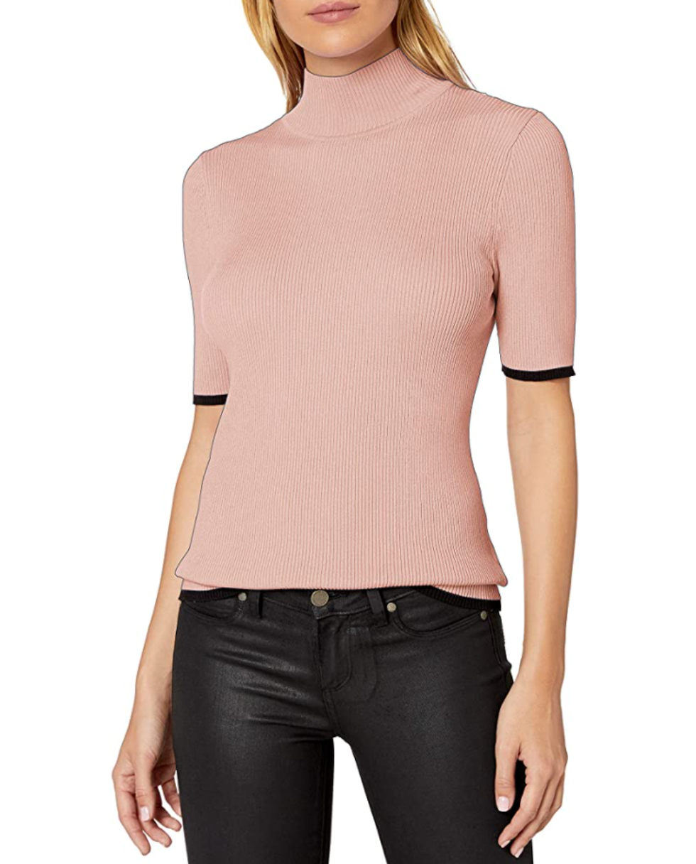 Available in blush, beet, storm, and other colors, this Kenneth Cole sweater is perfect for creating layered fall outfits. The ribbing contours to the shape of my torso for a sleek look, and it’s made from 100% breathable viscose.