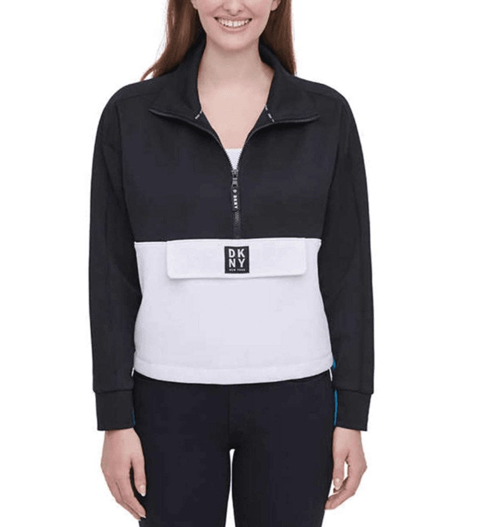 With a half-zip closure to keep the wind out all season long, this half-zip from DKNY is a must-have. I like to wear it with dark leggings or jeans, and the cord at the waist lets you adjust how it fits.