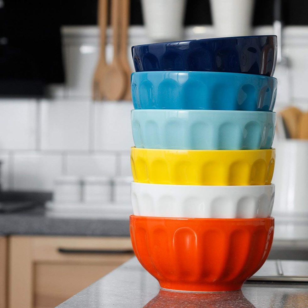 I have a little set of these porcelain bowls which I bought from Anthropologie for much more than these cost, and they're seriously identical. Save money without sacrificing style with this affordable and colorful set! If bright colors aren't your jam, they also come in a set of cool blues or fresh white. They're the perfect size for soup, cereal, ice cream sundaes and more, and they're durable as heck. Even with two small kids using them all the time, they've never chipped!This Tank Top Hanger Adds So Much Room To Your Closet