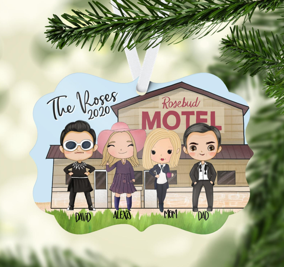 This black-and-white ornament comes in a variety of ribbon choices, including a festive red-and-black checkered pattern... Oh, and it totally sums up our feelings for this year. Ew, 2020.How cute is this Cartoon Rosebud Motel bauble?