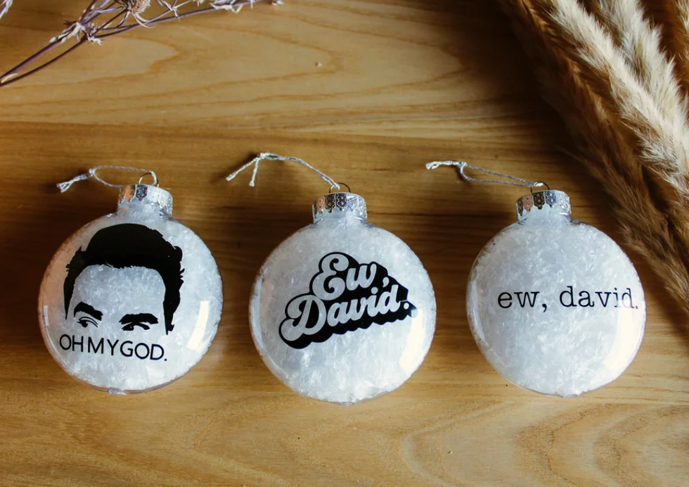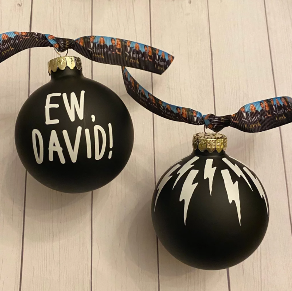 With "Ew, David!" on one and David's black-and-white lightning bolt sweater on the other, you can't go wrong with these ornaments... Plus, they come with custom-made Schitt's Creek ribbons. What's not to love? For more cool online products, keep scrolling...Trending