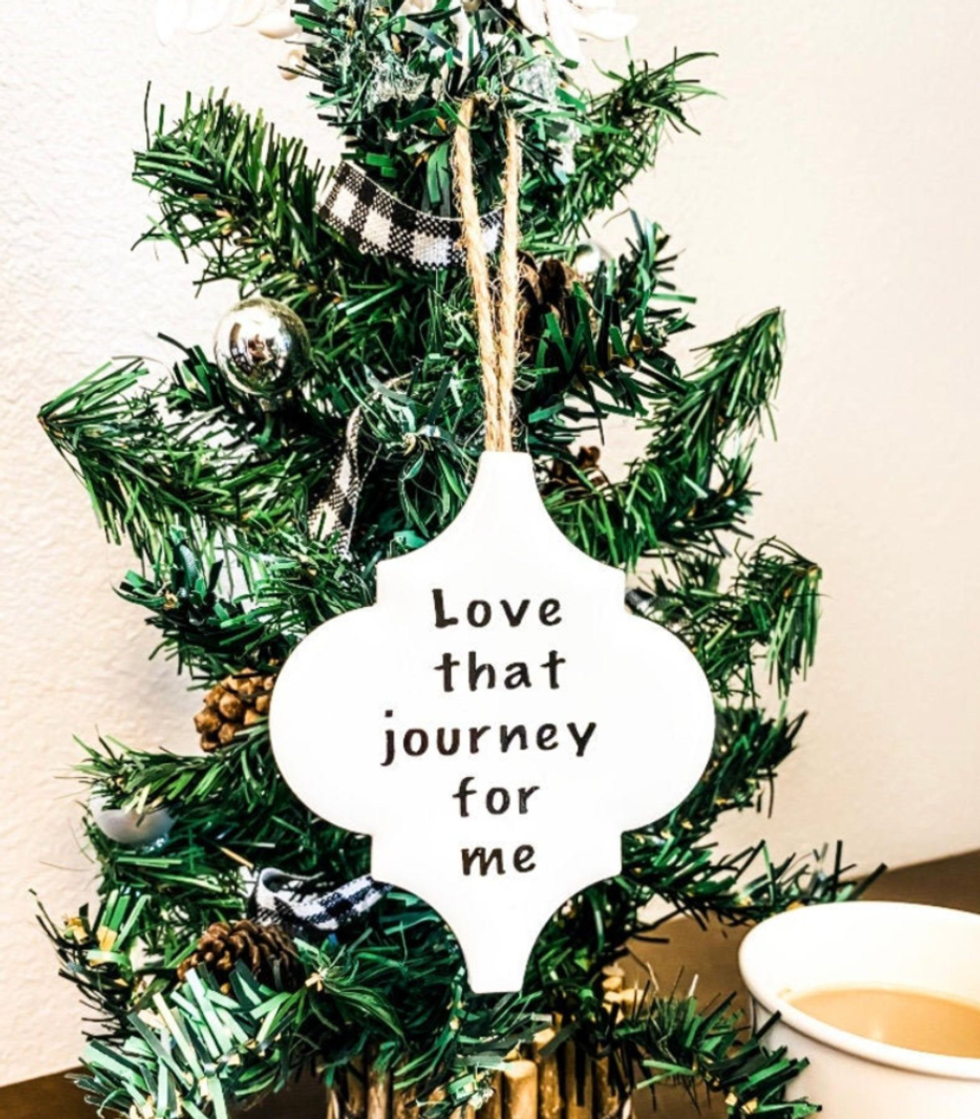 These super tiny black sweaters come in either white stars along the collar or with the word, "Icon"... And they're guaranteed to look so cosy and cute on your tree.And then we have this dainty and stylish Love That Journey For Me Bauble.