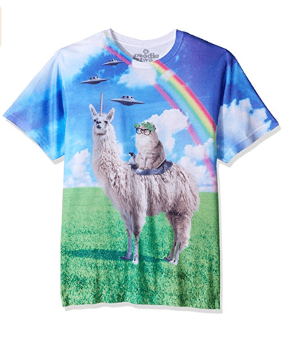 Someday, you will need a skin-tight full-body spandex suit, and you don't want to be caught without one when the time comes. This one comes in seven colors, so you can dress as the whole rainbow!This T-Shirt depicting a cat riding a llamacorn.