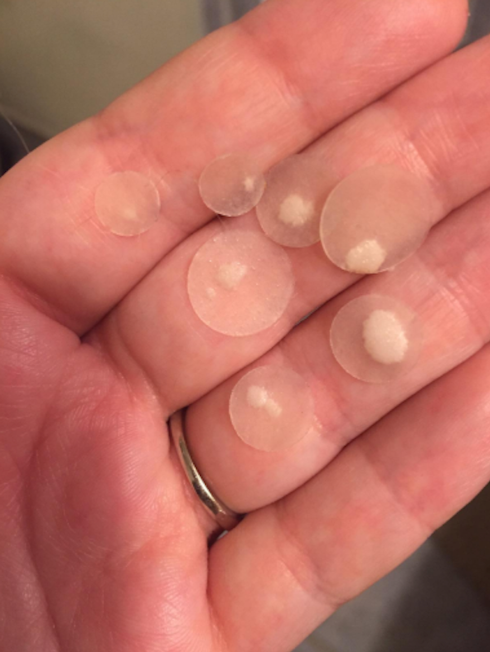 When you put these patches on your face, they look basically like Band-Aids. The white spots you see in the picture up there? Yeah, that's all the gross gunky stuff they pulled out of various zits. These things are super popular — they have nearly 3,000 reviews on Amazon!