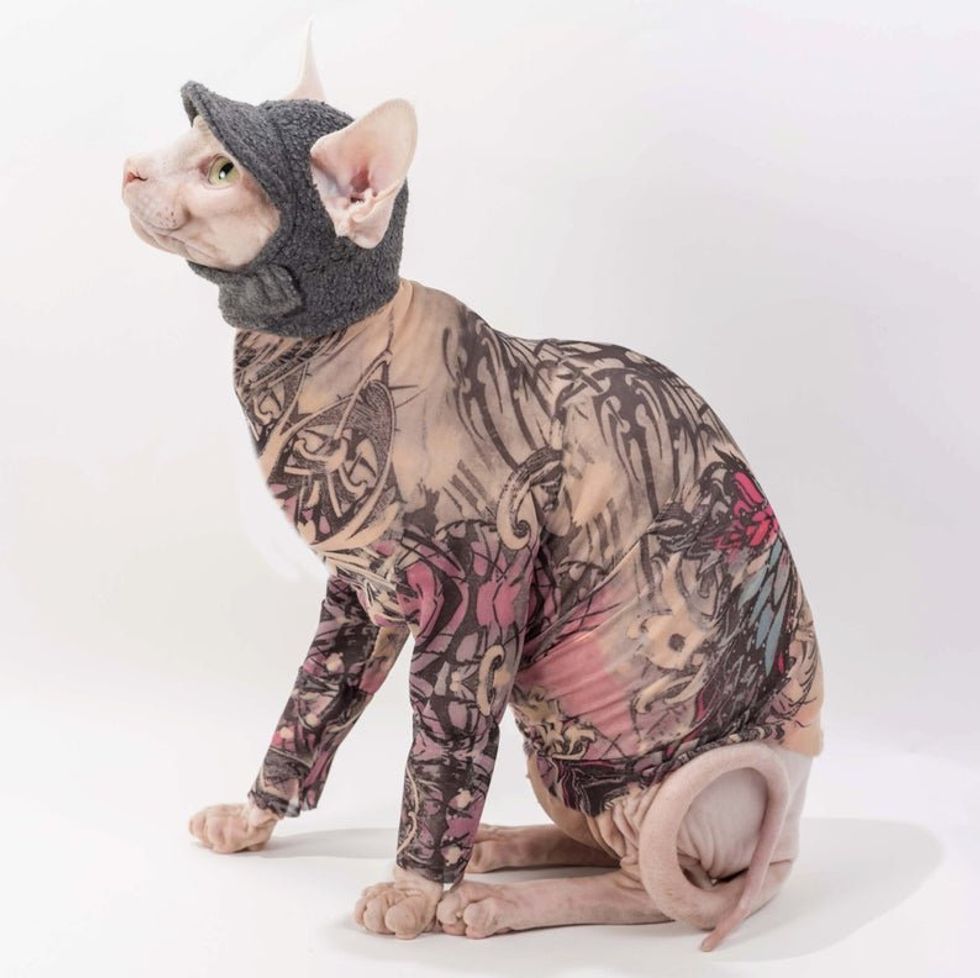 Why, by creating garments for sphinx cats that give the illusion of a tattooed bod - minus the pain and the permanence, of course.This colorful one is a particular fave.