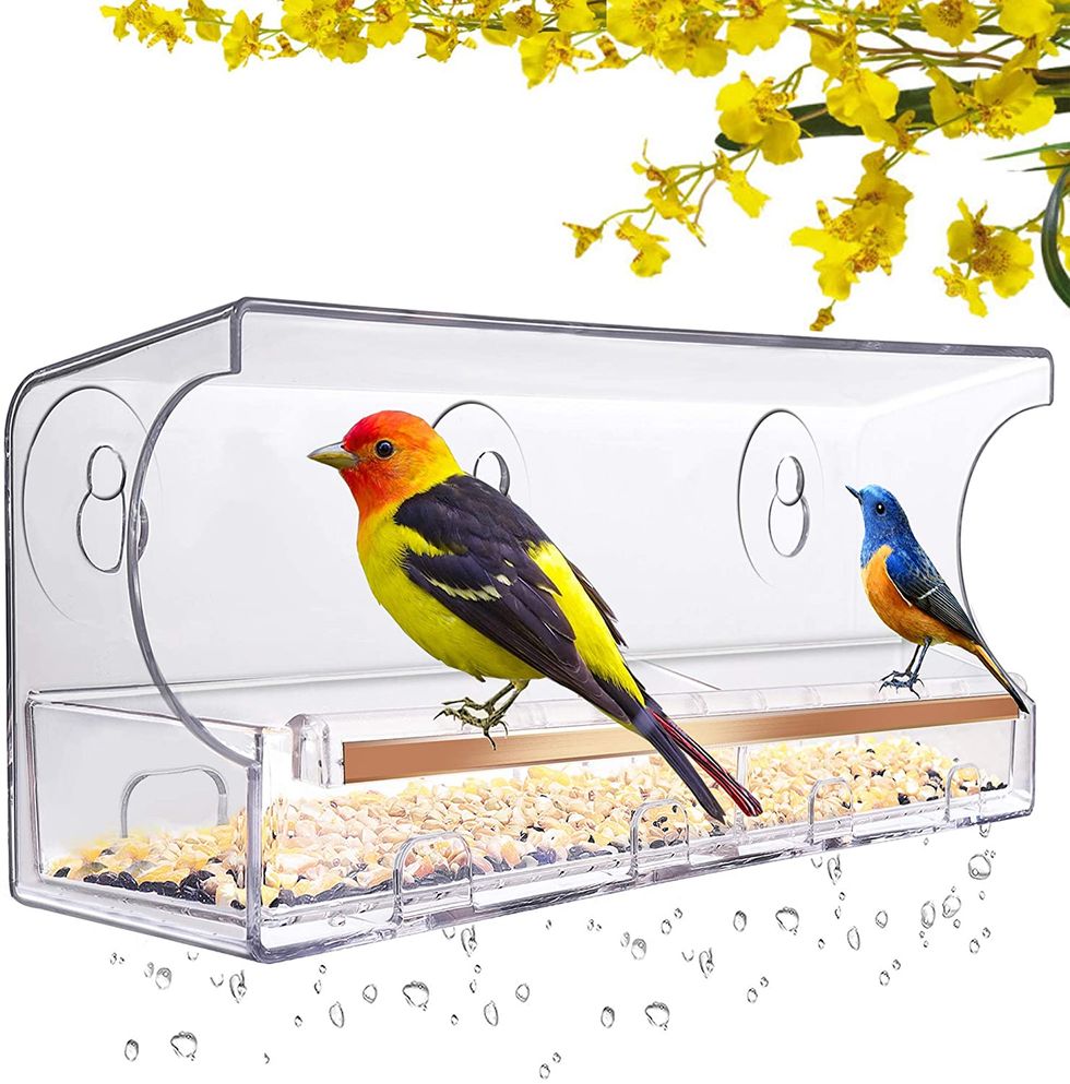 Here's another bird feeder specifically intended to hang on your window: it has suction cups intended to stick to your window in all types of weather, and a natural stylish arched design that'll protect the birds that come to feed. Plus, it holds a lot of seed - up to 4 lbs, in fact! And even though it's an enclosed arch, it has multiple perches that'll support more than one bird at a time.Solar Bird-Feeder for Outside Hanging
