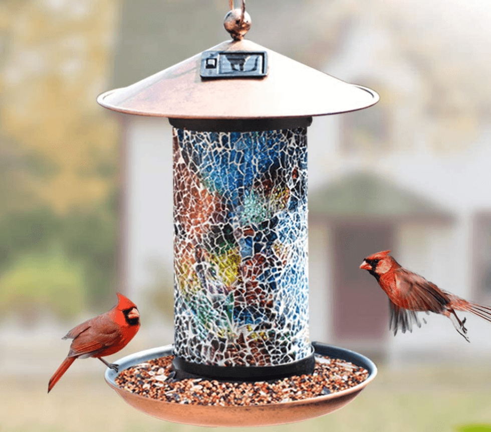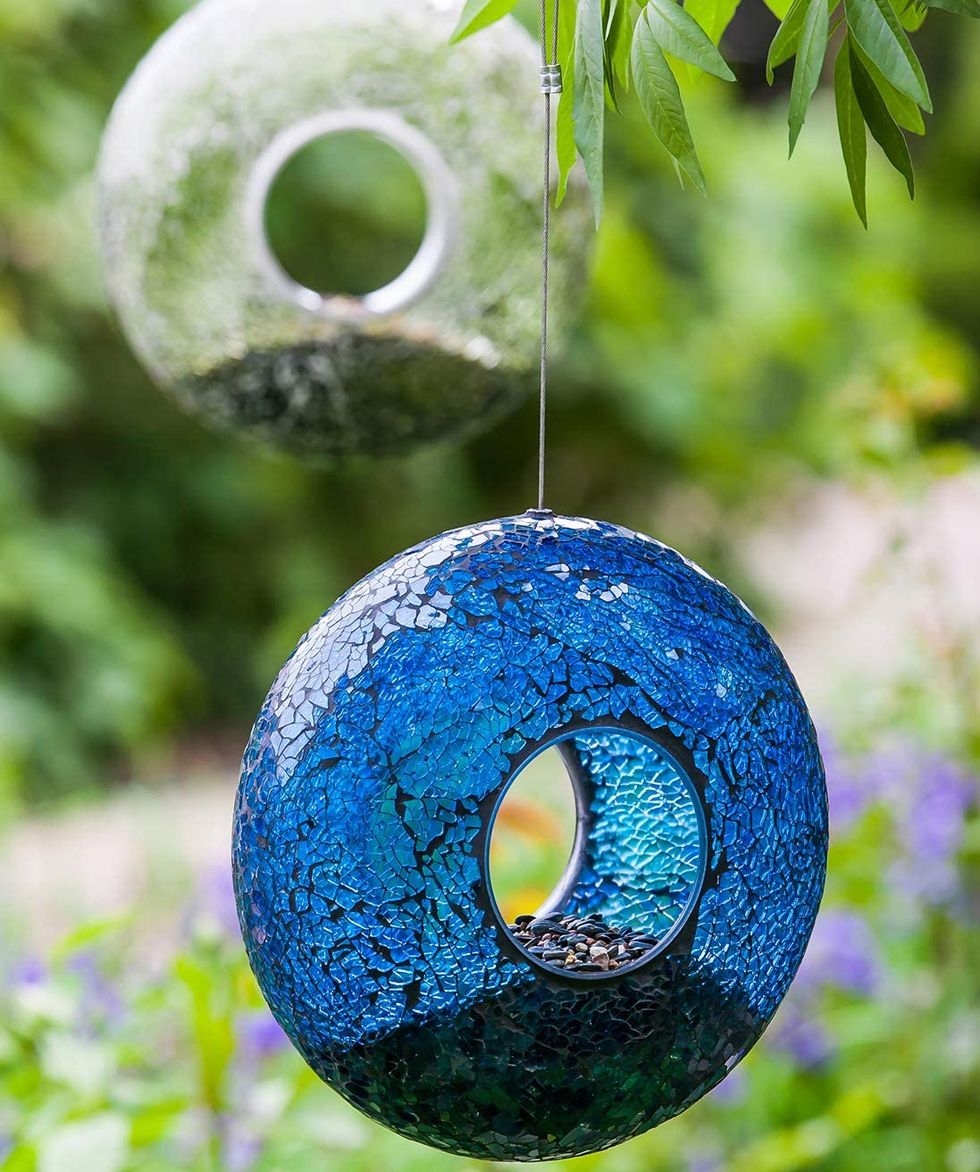 This bird feeder comes with a nifty twist: it's also a solar-powered LED light! So during the day, you have a gorgeous mosaic glass bird feeder to spruce up your garden, and during the evening you have a lantern entirely powered by the solar cells on its top. How cool is that?!A Ting Garden Hanging Bird Feeder
