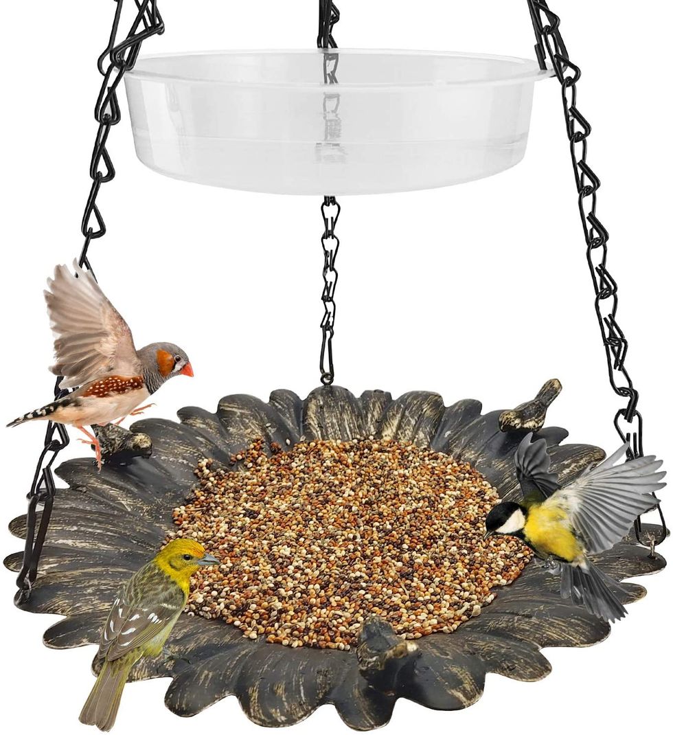 Here's another 2-in-1 bird feeder and bird bath situation, this one with a different configuration and style. Here, the trays hang one over the other in a two-tiered layout so that birds can feast and bathe in one visit! It's both decorative and entertaining, and super easy to clean. Win-win!Trending
