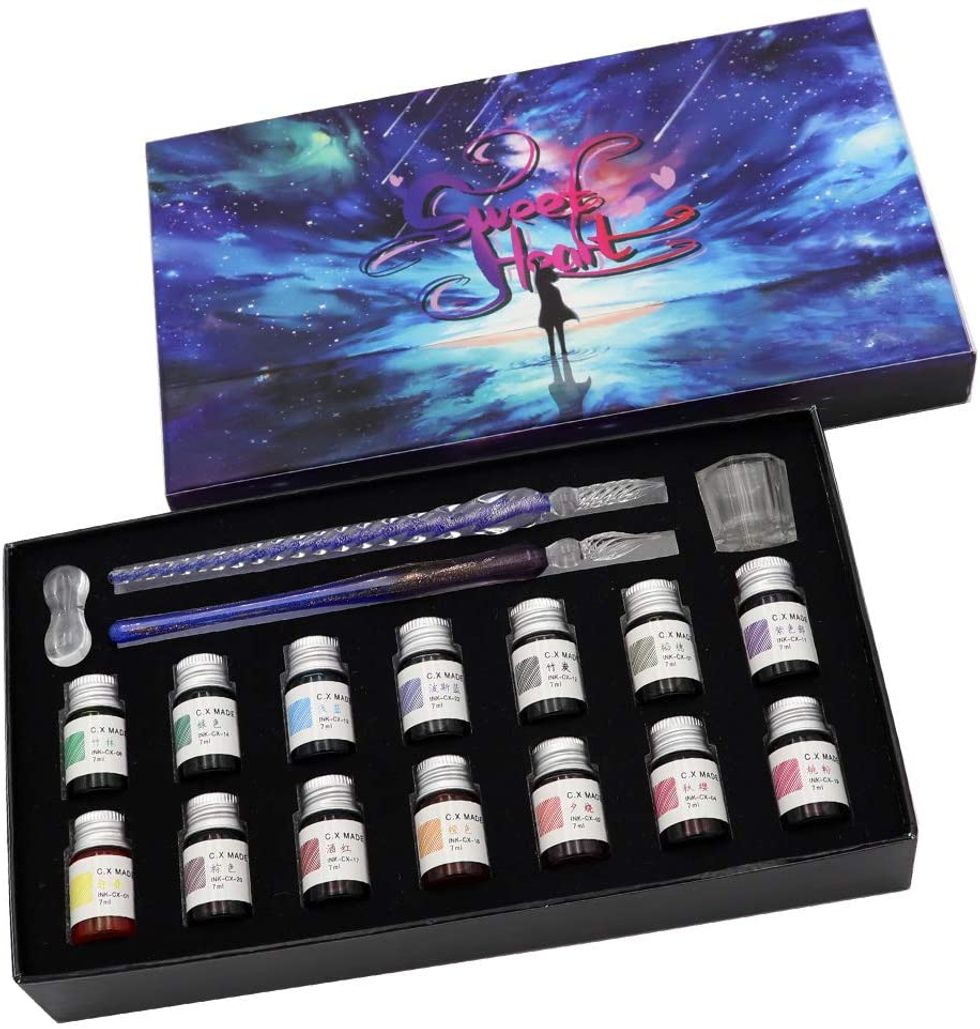 This handy calligraphy set comes with a pen, a collection of 12 different pen nibs, an instruction booklet, and 2 bottles of calligraphy ink (black and red). It's perfect for beginners, so if you're looking to get started, this set really does have everything you'll need!AXEARTE Glass Dip Pen Set