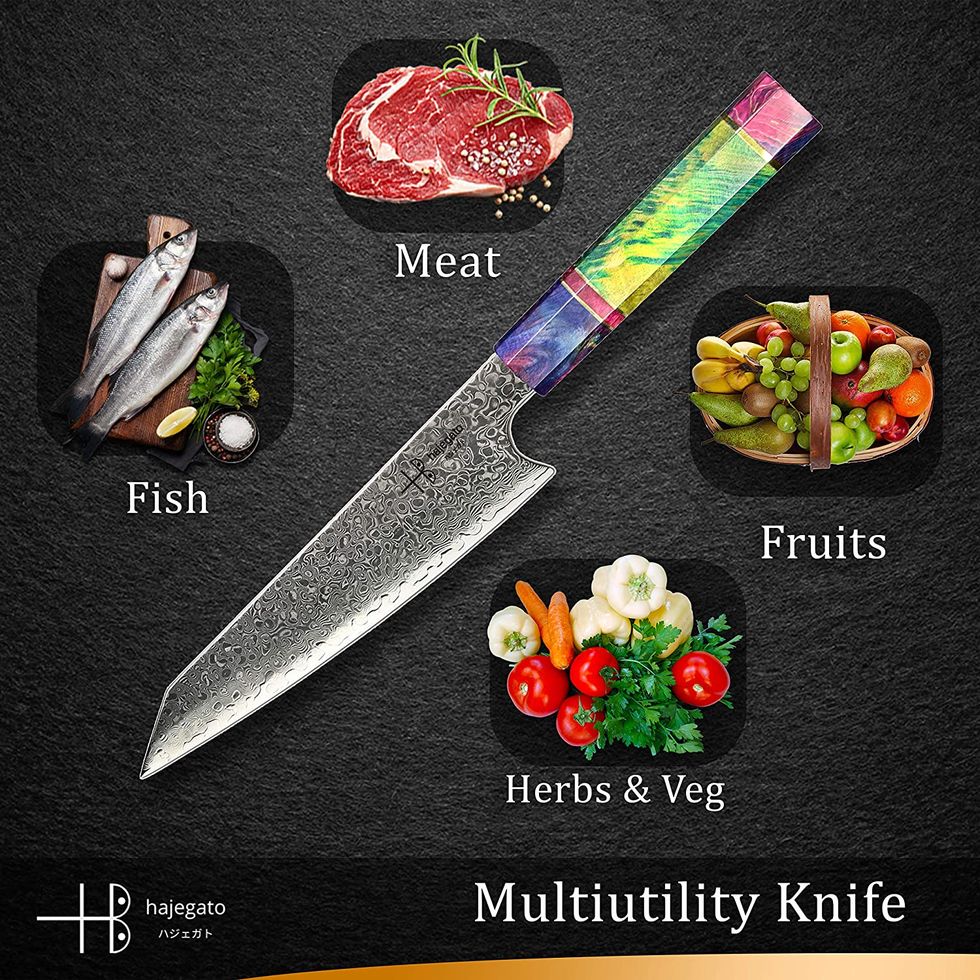 Power and strength aside, the Damascus Chef Knife Hajegato Unique One Of Kind Handle Professional Knives are sure to become a beautiful addition to your kitchen counter. Each knife features a unique color combination and design, along with Damascus stainless steel blades.Ross Henery Professional Knives