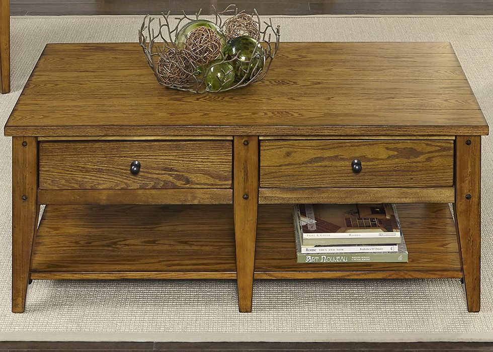 One of the best parts about adding a coffee table to your living room is being able to hide random clutter inside it, and if you're in need of one with as much storage as possible, take a look at this Liberty Furniture Industries Lake House Cocktail Table. It features two large drawers and a separate space underneath for even more storage options.