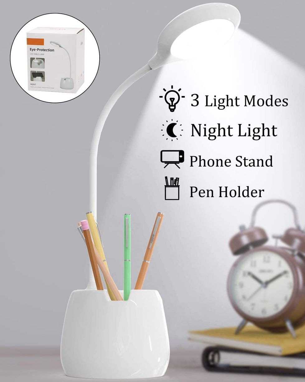 If our first option was the best choice if you want your lamp to take up absolutely no space, our second option is best if you want to optimize your space. This one is both a phone stand and a pen holder so that you can free up space on your desk. It also features the ability to use it as a nightlight, USB charging, and a flexible goose neck. I personally love the goose neck design if I'm working on a small or detailed project that needs close up light.Charge it