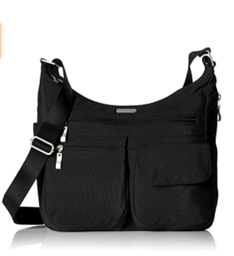 One of the bigger options on our list, the ALDO Women's Greenwald Crossbody Bag is a perfect everyday bag. With a secure foldover flap, this faux leather women's crossbody bag features edgy black metal hardware. Plus, its medium size makes it conducive for holding all of your essentials and then some.Baggallini Everywhere Bagg with RFID