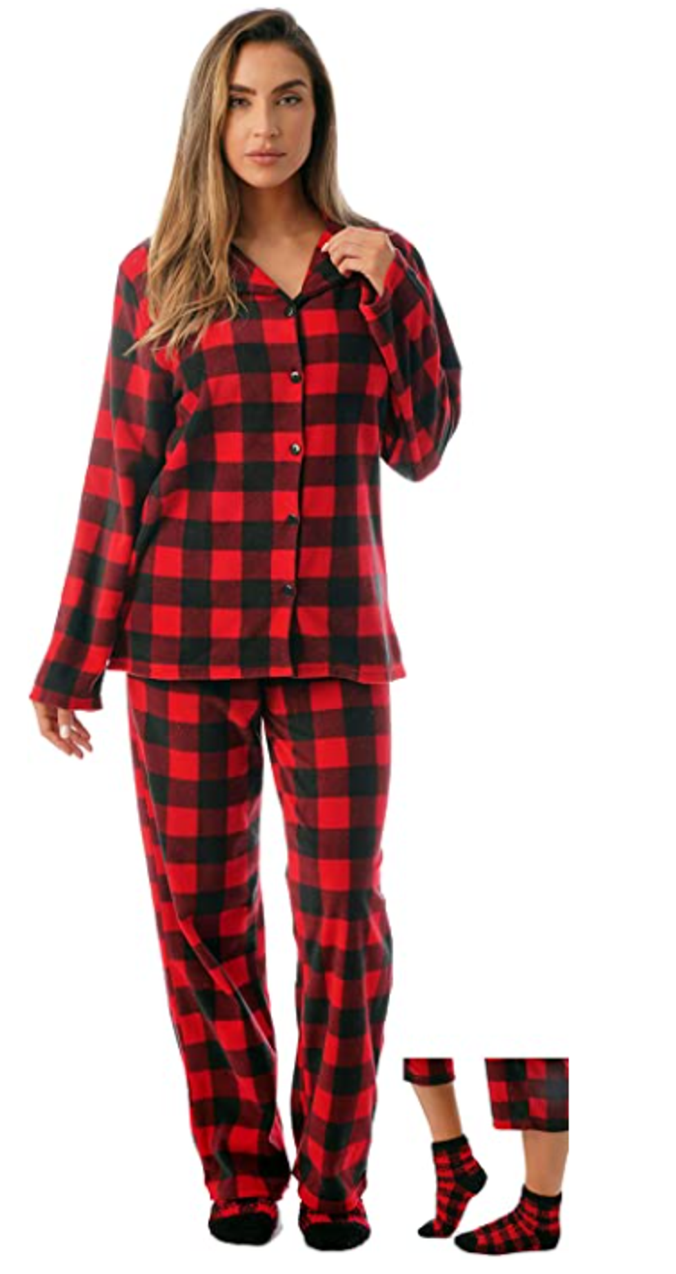 Ok so these PJs are not technically fleece, but they are a close cousin: microfleece. If you're not the hugest fan of flannel, microfleece keeps you warm but is nice and breathable so that you don't end up sweaty. One of my favorite things about this set is that it also comes with socks. If you don't know the importance of thick winter socks, you have not lived through a Minnesota winter. You want them for sure.