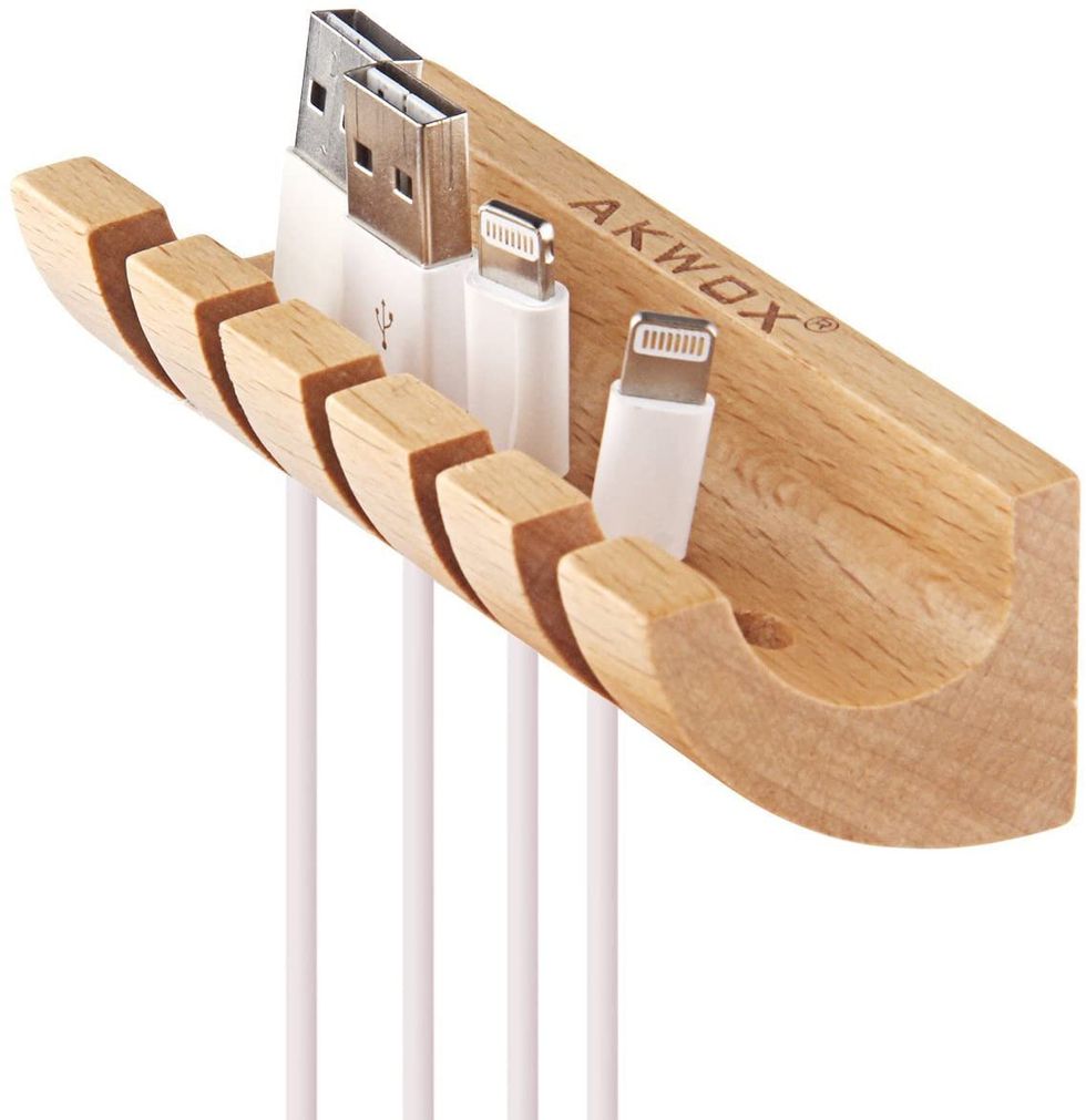 Alternatively, there's this wooden cable organizer that acts like a sort of group hanger for your cords. It comes with five slots of differing sizes, so that you can hang a variety of cords from it with ease. It's also attachable by quickly peeling and sticking it to any surface, so it can be set up pretty much anywhere in the house or office.