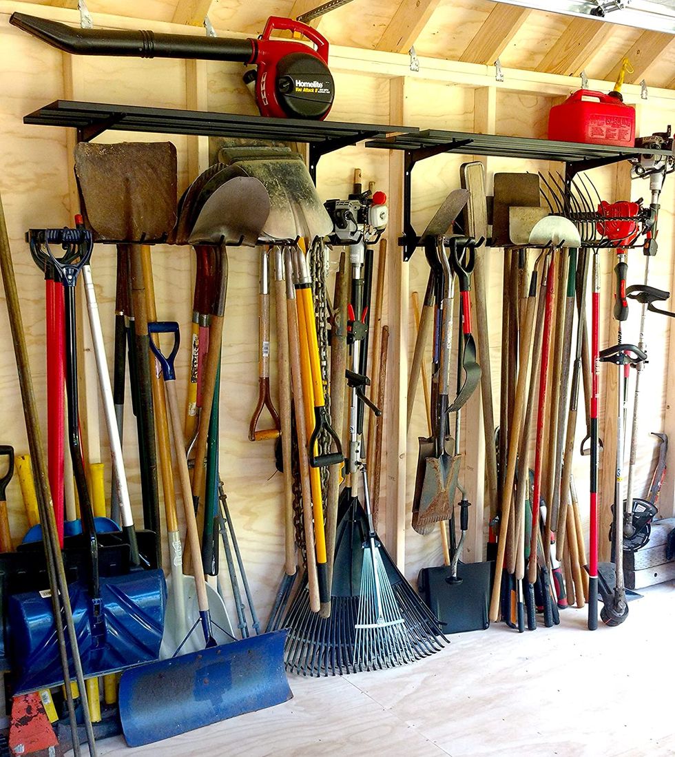 Get your tools in check with this StoreYourBoard Tool Rack and Storage Shelf, Home, and Garage Organizer. It includes a built-in top shelf and a row of hooks that are perfectly sized for holding your rakes, shovels, brooms, hoses, and any other garage and garden essentials.