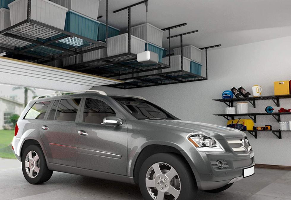 These FLEXIMOUNTS 4x8 Overhead Garage Storage Rack is seriously clever. Instead of taking up valuable space by being mounted to your garage or basement walls, these shelves hang from the ceiling so you double your storage options without making your space feel cramped.