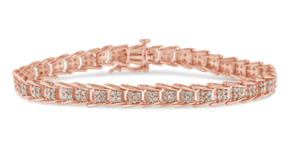 If you haven't gotten in on the rose gold trend yet, this .925 Sterling Silver 2.0 Cttw Diamond Nested Link 7" Tennis Bracelet is a lovely way to try it out. The fan-shaped design adds a unique touch and the 2.0 ct t.w. diamonds are hand-set for an artisanal look.Best Tennis Bracelet with Feather Details