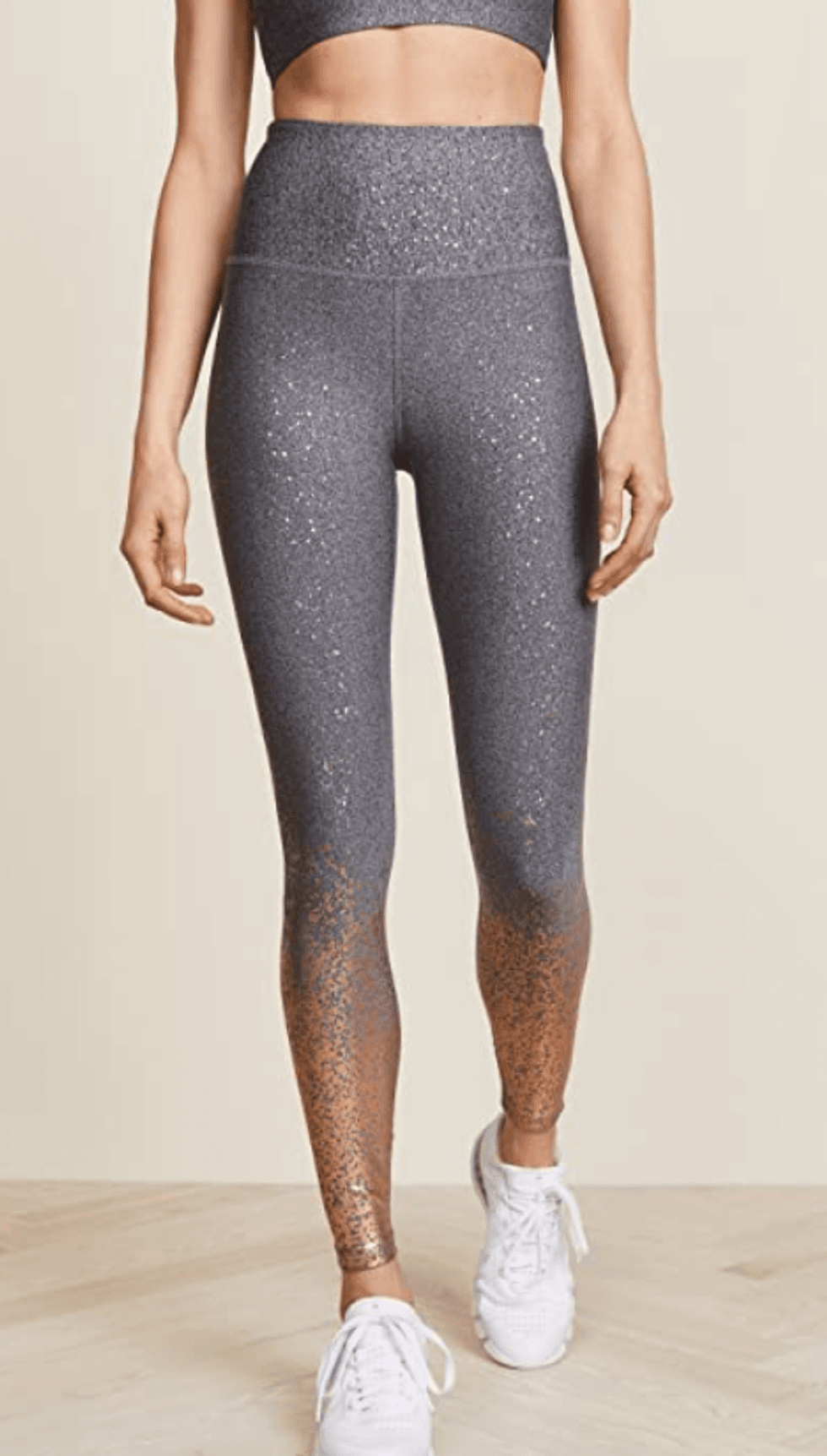Dare to dazzle with these Beyond Yoga Alloy Ombre Sport Flex High Waist Midi Leggings. The sparkly metallic accents bring major glam to an otherwise sporty pair of yoga pants. The mid-weight jersey is lightweight enough for the summer but will still keep you warm when the temperature starts to drop.