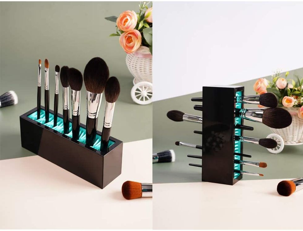 No matter how thick or thin your makeup brushes are, this organizer can still handle them. The silicone dividers on the inside stretch and contract to fit your brushes so that they don't slip out, but you're not limited to just brushes — I actually use mine for pencils and pens on my desk. Choose from five colors: black, white, pink, and more.