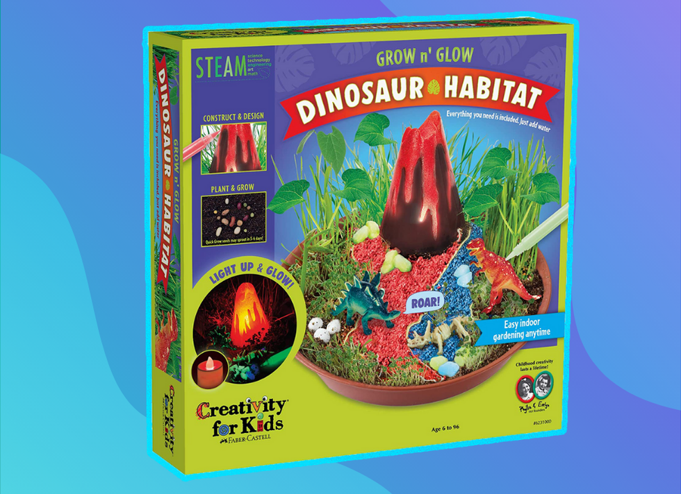 This unique craft set provides immediate fun plus long-term satisfaction! The dinosaur habitat includes everything they need to set up a terrarium with two full plant lifecycles, including dinos, fossils, a light-up volcano, lava paint, glowing stones, planting container, potting mix, quick grow chia, wheatgrass and bean seeds, soil scoop, and mister.These Dot Markers for Toddlers and Preschoolers