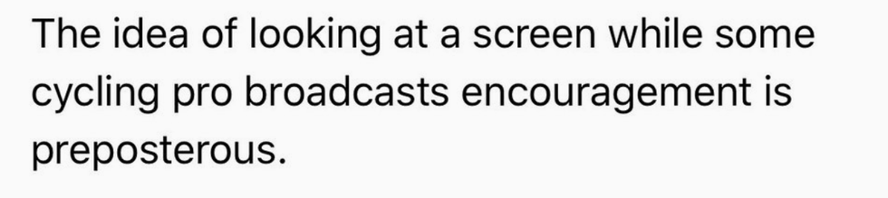 Again, where's the lie? There are maybe four people in the world I'd want broadcasting encouragement while I'm on a stationary bike, and not one of them is a cycling pro. (For the record, those four people are Chance the Rapper, Barack Obama, Dwayne "The Rock" Johnson, and former Nintendo President Reggie Fils-Aime.)