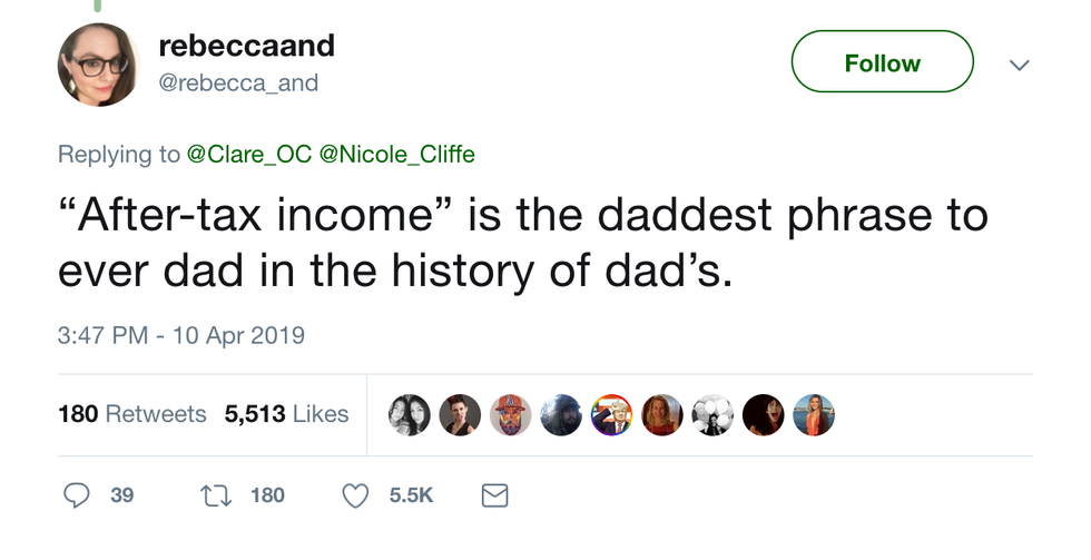 I agree that "after-tax income" is a pretty dad-like phrase, but is it the most dad-like phrase? I think that distinction would go to, "Hey kiddo, how was your baseball game? Sorry I missed it, got stuck at work again."